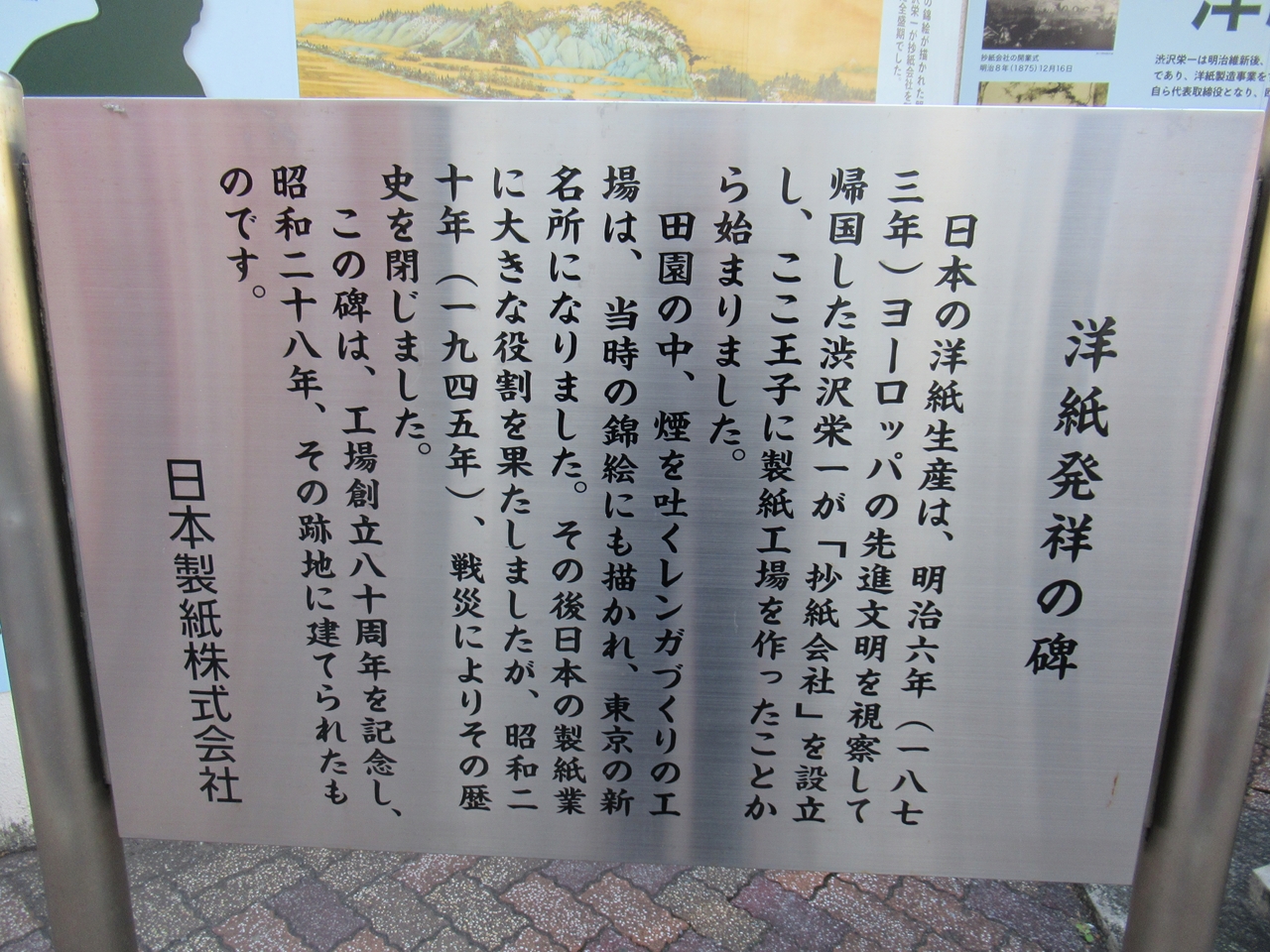 「洋紙発祥の地 王子」の説明と石碑が目立たないところにある.