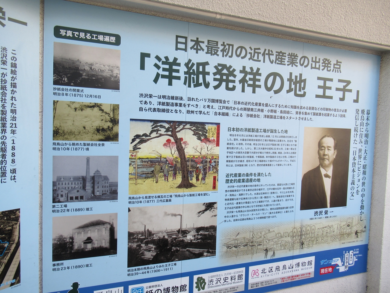 製紙会社は,戦後の過度経済力集中排除法による歴史的な変遷から,王子製紙が苫小牧製紙,本州製紙,十條製紙の3つに分割されて,今の王子の場所は十條製紙に受け継がれた.そして,十條製紙は4社合併により日本製紙と会社名が変わったため,現在は,王子にある施設は,日本製紙となっているのである.