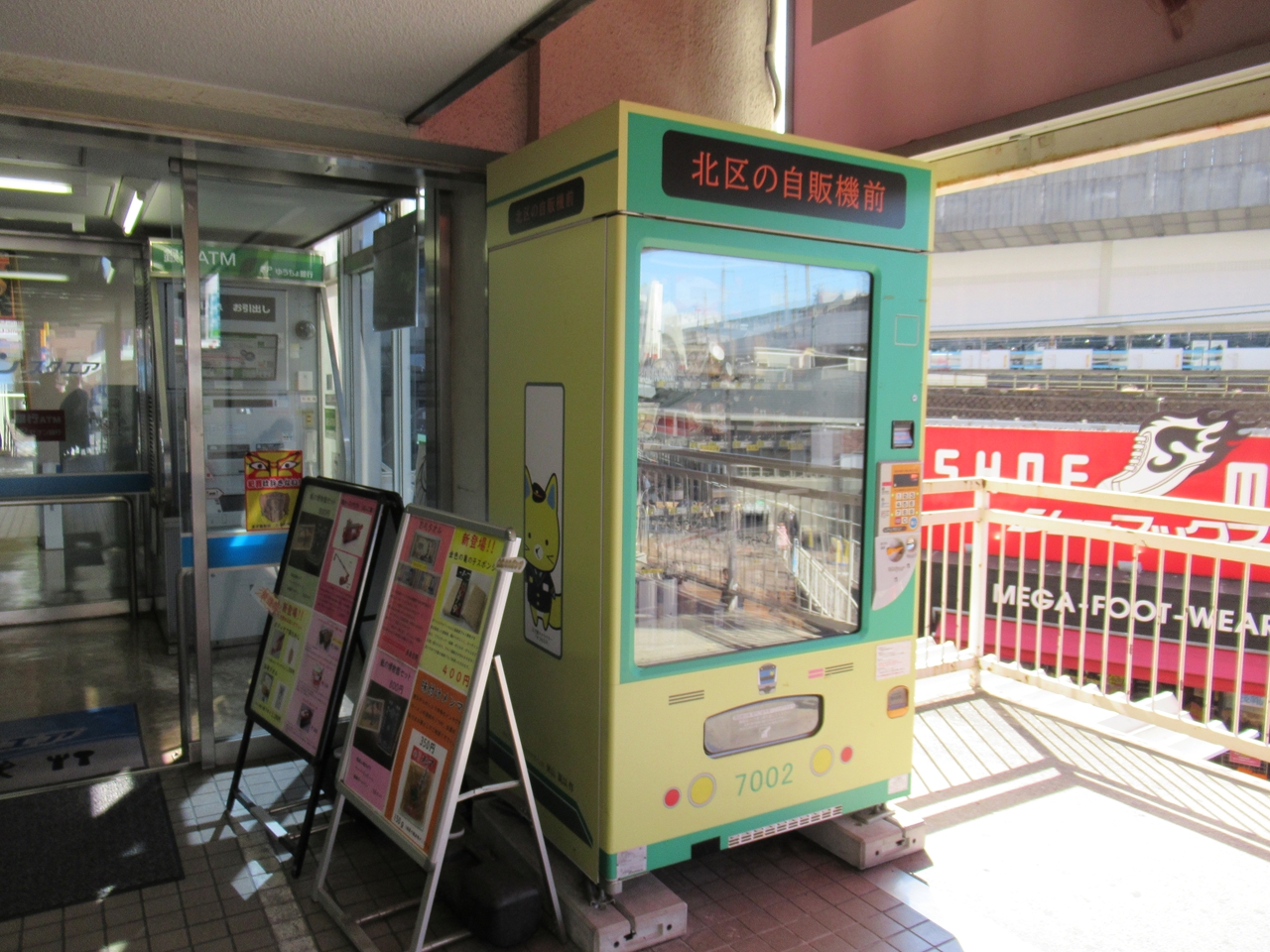 都電の形をした北区の自動販売機.東京都北区内で作られているものやゆかりのある商品が売られている.