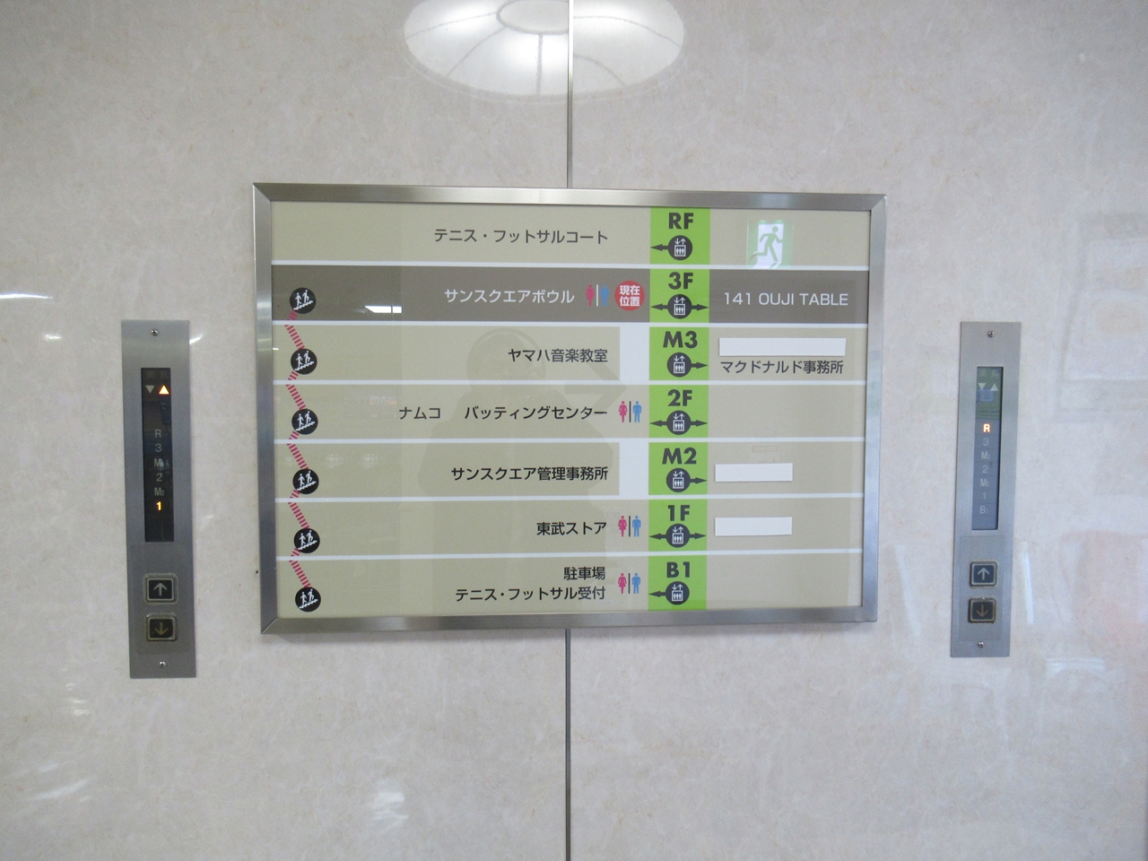 サンクスエアのフロアー案内板.M2,M3という階数が特徴的.